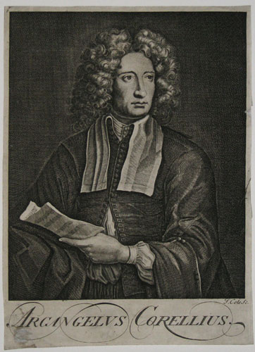 Arcangelo Corelli (1653-1713) was an Italian violinist and composer of Baroque music. Corelli began in Paris from where he went on to travel and accepted many invitations from nobility, including his stay at the palace of Cardinal Ottoboni. He is remembered for his precision and stylistic playing which he passed onto his pupils. His compositions for the instrument mark and epoch in the history of chamber music, influencing Johann Sebastian Bach. One of several engravings based on the famous portrait of Corelli by Hugh Howard (Oxford, Music Faculty collection). From the Collection of J.S. Bumpus.