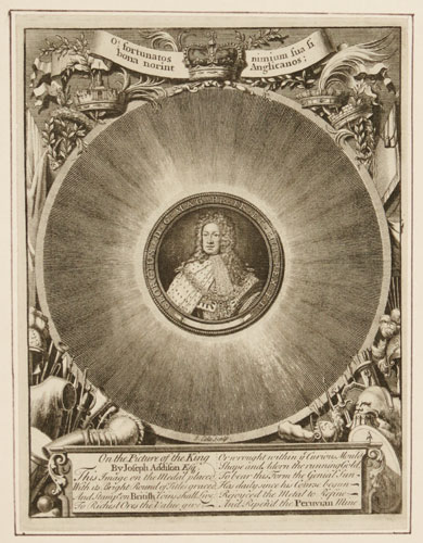 [George I] O! fortunatos nimium sua si bona norint Anglicanos. Georgius D.G. Mag. Br. Fr. Et. Hib. Rex. F.D. On the Picture of the King by Joseph Addison Esq. This Image on the Medal place Wtih its Bright Round on Titles graced And Stamp.st on British Coins shall Live To Richest Ores the Value give. Or wrought within ye Curious Mould Shape and Adorn the running Gold. To bear this Form the Genial Sun. Has daily since his Course begun. Rejoyced the Metal to Resine. And Ripen'd the Peruvian Mine.