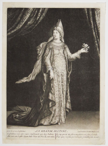 A portrait of an Eastern sultana in ornate robes and holding a flower.
