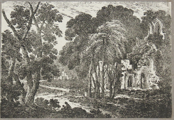 Early lithograph by Richard Cooper (1740-1814). The son of another engraver, Cooper worked for a time in Italy, where he befriended Alexander Runciman and developed a style of landscape painting similar to that of Runciman (he became known as the 'English Poussin'). After marrying in Edinburgh in 1777, Cooper settled in London around 1787, where he dedicated himself to drawing (he became drawing master at Eton) and occasionally printmaking. This lithograph was included in the 1807 edition of the first portfolio of artists' lithographs, 'Specimens of Polyauthography'. The new medium allowed artists to draw directly onto a prepared stone, allowing artists to make prints which arguably resembled drawings more than any earlier printmaking technique. Unlike many printmaking techniques, lithography required no special training as artists could work directly onto the plate and leave specialist printers to actually make the prints. For this reason many artists who were not trained printmakers (such as Géricault and Delacroix) often worked in lithography. Ex: collection of the Late Hon. C. Lennox-Boyd.