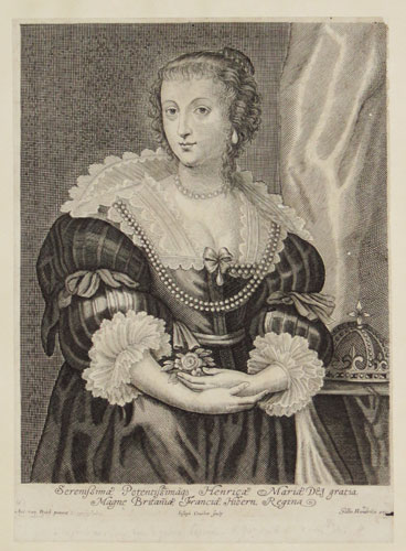 Ant. van Dyck pinxit. Ioseph Couchet Sculp. Gillis Hendricxs exc. Engraving. Sheet: 220 x 310mm (8¾ x 12"). Trimmed and tipped into album sheet. Some damage. A half-length portrait of Henrietta Maria (1609-1669), queen consort of Charles I of England and daughter of King Henry IV of France.