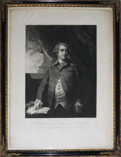 A full-length portrait of Charles Cornwallis (1738-1805), 1st Marquess Cornwallis, leaning on long cane, eyes to front, wearing uniform, cocked hat and long boots, troops in landscape at right. Cornwallis is best remembered as one of the leading generals in the American War of Independence. Despite his surrender at Yorktown in 1781, Cornwallis continued his military career, becoming Governor-General of India in 1786. This portrait celebrates his victory in the Third Anglo-Mysore War (1790-2), for which he was made Marquis. After Daniel Gardner (c.1750-1805). CS: 14, i of ii. Ex: Collection of The Hon. Christopher Lennox-Boyd, his state iii of iv.
