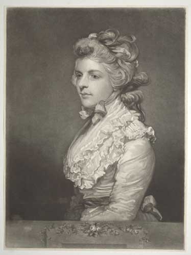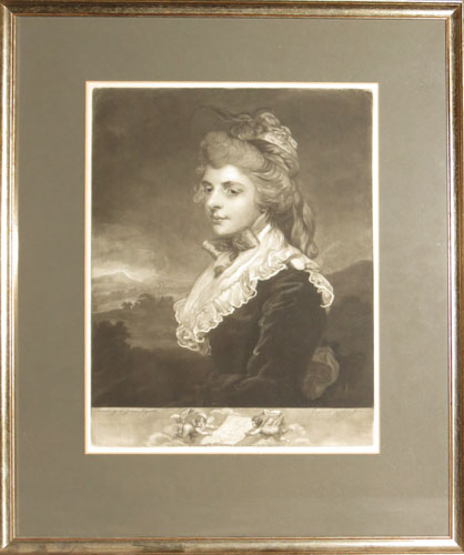 A half-length portrait of actress Frances Kemble (1759-1822), wearing a dark dress with white frill, mountainous scenery behind. The title is on a scroll held aloft by cherubs. The younger sister of Sarah Siddons, Kemble married a Shakespeare scholar, Francis Twiss. From 1807 she ran a girls' school in Bath. CS 42. Russell 42, ii of ii; Hamilton p.113, ii of ii. Ex: collection of The Hon. Christopher Lennox-Boyd.