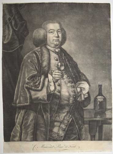 C. Maucourt Pinx.t er Fecit. [n.d., c.1760.[ Scarce & rare mezzotint. Sheet Sheet 335 x 245mm (13¼ x 9¾"). Trimmed to image on three sides, a few nicks to edges. A three-quarter length portrait of an affluent man in fur-lined coat and brocade waistcoat, holding a glass, a bottle of hock on the table next to him. The subject was originally identified as Thomas Nowell (1710-80), a coffin plate chaser (a maker and engraver of coffin ornaments), but the Challoner Smith Corrections has amended this to William Novell (d.1761), publican of the Jerusalem Tavern, 55 Britton Street, Clerkenwell. CS: 3.