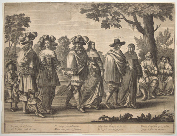 An allegory of life in four scenes, running left to right. On the left is a young boy holding up the skirts of a young woman, being walked by a man marked as being aged 25; next are couples aged 40 and 60, and ending with a seated couple, aged 80.