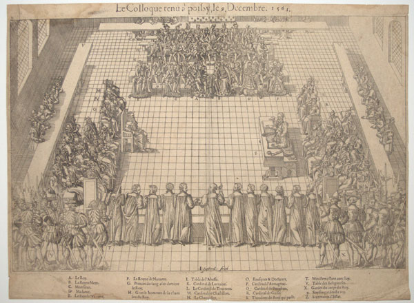 The Colloquy of Poissy, a conference held 9th September - 14th October 1561, intended to reconcile the Catholics and Hugenots of France, a decade before the infamous massacre of St Bartholomew in 1572. It was attended by 11-year-old Charles IX ('A' in the key) and his mother, Catherine de' Medici ('B') and the King and Queen of Navarre ('E' & 'F'). Engraved by Jacques Tortorel as plate 11 of 'Histoires diverses qui sont mémorables touchant les Guerres, Massacres & Troubles advenus en France en ces dernières années', 1569-70, a series of thirty-nine illustrations (plus title-page & foreword).