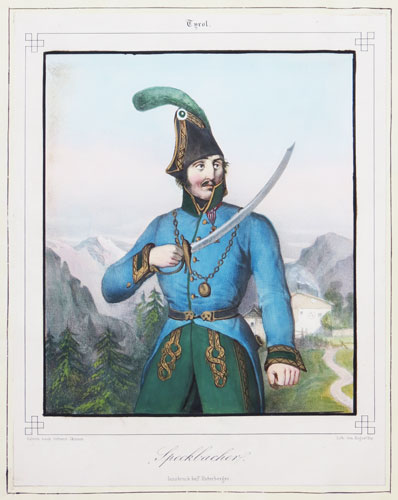 Josef Speckbacher (1767 - 1820), leading figure in the rebellion of the Tyrol against Napoleon; in military uniform, holding a sword, mountain scenery behind. From a patriotic series of Tyrolese personalities (from the Eastern Alps).