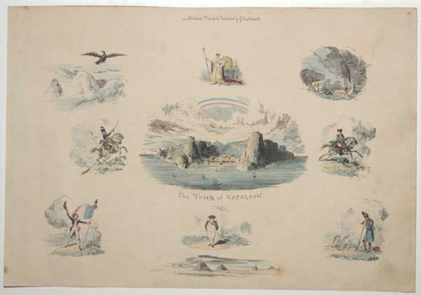 A view of the island of Saint Helena in the Atlantic Ocean, where Napoleon Bonaparte died on 5th May 1821, surrounded by eight military and Napoleonic vignettes. A satirical print from 'My Sketch Book' by George Cruikshank (1792 - 1878).