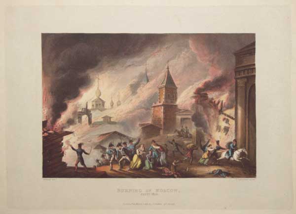 The fire that destroyed most of Moscow during the French occupation of 1812. Adapted from a peaceful view of the city in Robert Bowyer's 'Triumphs of Europe'. From W.H. Ireland's 'Life of Napoleon Bonaparte', 1828. Tooley 278.