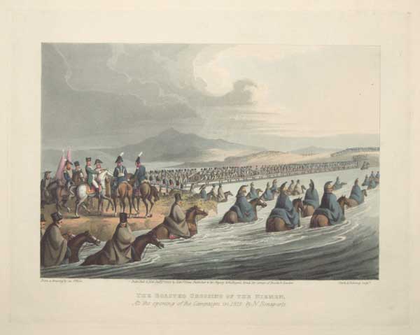 Napoleon Bonaparte watches from the bank as his infantry cross a makeshift bridge (actually three pontoon bridges) and his cavalry ford the Neman River into Lithuania, at the start of the Russuan Campaign. From Orme's ''Historic, Military, and Naval Anecdotes, of Personal Valour, Bravery, and particular Incidents which occurred to the Armies of Great Britian and her Allies, in the last long-contested War, terminating with the Battle of Waterloo''.