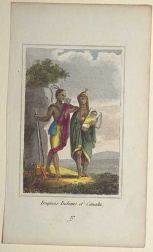 The man carries a bow and quiver of arrows on a backpack, the woman has a baby in a papoose. A plate from Mary Anne Venning's A Geographical Present; being being descriptions of the principal countries of the world. With representations of the various Inhabitants in their respective costumes, beautifully coloured'.