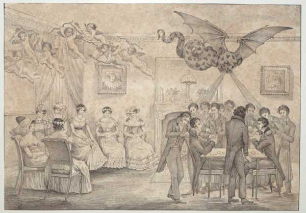 Possibly Americana. A scene in a drawing room: on one side are the young women in their party dresses, with a flock of cherubs with bows above their heads, representing romantic thoughts; on the right the batchelors are fixated on a game of cards, with a demon with a bat's head and wings and coiled serpent's tail, skin marked with the suit symbols, breathing down on them.