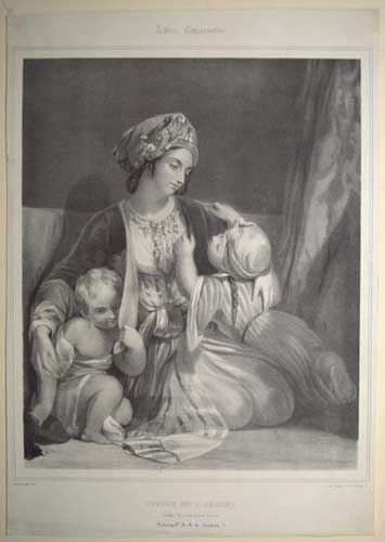 A Greek woman with two children. A scene from Lord Byron's 'Childe Harold's Pilgrimage', published in the 'Album Cosmopolite, ou Choix des Collectionss de M. Alexandre Vattemare, compose de sujets historiques et religieux, paysages, marines'.
