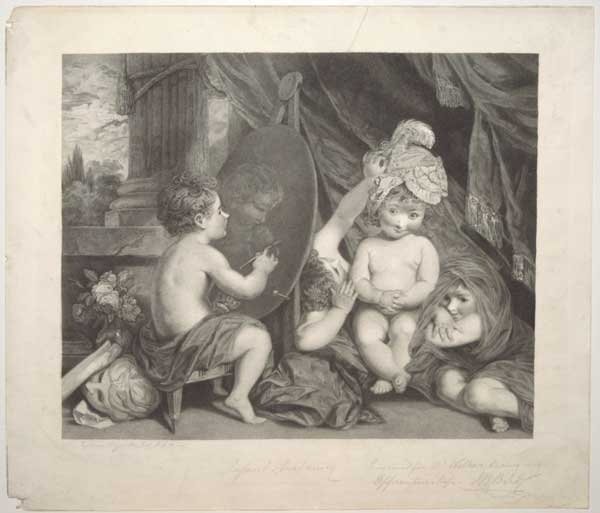 A young boy painting on an oval canvas a young girl with a fashionable hat, who is flanked by two other children; curtain and pillar behind, landscape beyond at left. As well as giving the title and artist, the manuscript also notes 'Engraved for W. Walker during my Apprenticeship - J.B. Bird', contradicting the attribution on the finished plate. The same picture had earlier been engraved as a small mezzotint by S.W. Reynolds. Not in Hamilton; for S.W. Reynolds' mezzotint, see ref. 21500