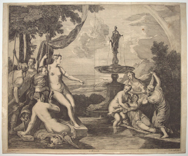 Callisto, a nymph, is discovered to be pregnant by Jupiter and is expelled from Diana's group. Plate 96 from 246 plates of David Teniers' 'Theatre of Paintings'.