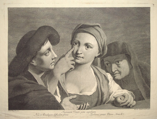 A young man addresses a young woman in the centre who holds an apple, with an elderly bawd watching behind. The lines from Horace refers to the scene in the Oddysey in which Penelope receives unwelcome suitors. BM 1951,0714.159. From the Airlie collection, Cortachy Castle.