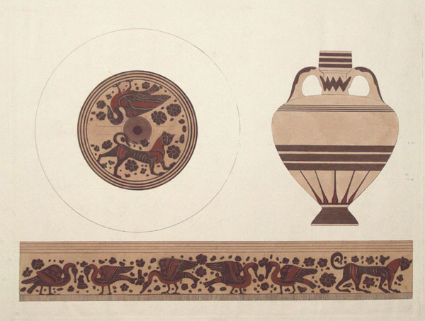 An illustration of a Corinthian amphora, with panels showing the patterns of lions and geese on the body and base. From the Airlie collection, Cortachy Castle.
