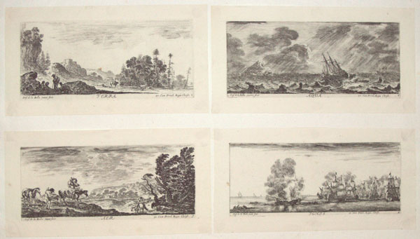 The set of Four Elements: Earth & Air are landscapes; Fire and Water are seascapes, Fire with a ships on fire, Water with a storm. Etched by Stefano della Bella (1610-54), one of the greatest of Italian printmakers, whose diverse output, characterised by the compression of great precision and detail into small composions, has been the focus of a number of exhibitions and scholarly publications in recent years. It was also influential on later seventeenth century printmakers such as François Collignon and Israel Silvestre. De Vesme 753-6., states ii of iii. From the Airlie collection, Cortachy Castle.