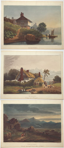 Three fine aquatints, printed in colours and hand finished. Morning has J. Whatman 1822 watermark, Sheet 210 x 270mm (8¼ x 10½"). Trimmed within plate, losing publication line.