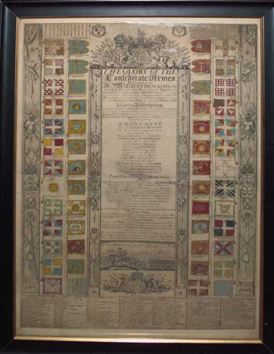 A record of the battle flags captured at the Battle of Blenheim, the hugely important victory won by the Duke of Marlborough and Prince Eugene of Savoy during the War of the Spanish Succession. Under the text is a small view of the battle with a five-point key. The Duke returned to England on the 14th December (Julian calendar); the flags (recorded elsewhere as 110 cavalry standards and 128 infantry colours) were borne in procession to Westminster Hall in early January, 1705. The British Museum has a version engraved by Spofforth in French, dedicated to Prince George of Denmark (BM 1927,1008.389).