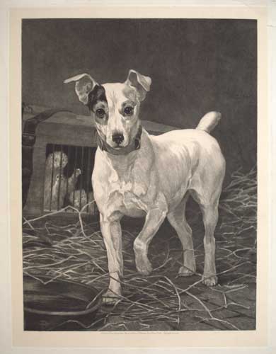 The image shows the black terrier laid down with the white terrier sat in front of him. The label reads: '''Hope'' (Cairn Terriers). A New Original Etching by Herbert Dicksee R.E.'. Herbert Dicksee and his family owned a variety of different breeds of dogs which enabled him to paint them from life, such as “Hope”. The Cairn is one of the native Scottish Breeds and from the 17th century had been used in the Western Highlands and the Isle of Skye to keep down vermin which were a threat to game. They often worked in small packs and they take their name from the Cairn - small outcrop of stones, common in the highland moors.