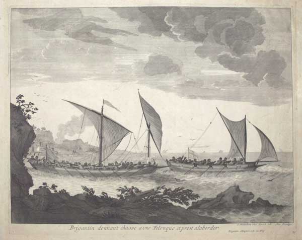 A scene of a brigantine chasing a felucca. It was originally published in Pierre Mortier's 'Le Neptune francois, ou, Atlas nouveau des cartes marines' in 1703; this example comes from the Valck reissue of 1724.