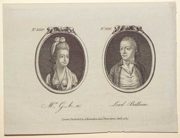Three medallion portraits: an untitled one of William Boyd, 4th Earl of Kilmarnock (1709-1746), flanked by portraits of two women. He was captured at the Battle of Cullodon and executed. The lines from John Gay's 'Beggar's Opera' refer to his statement after his capture: ''for the two Kings and their rights, I cared not a farthing which prevailed; but I was starving''. Sharpe 699, state i of ii, misidentified as Charles Edward Stuart; BM Satires 2853.