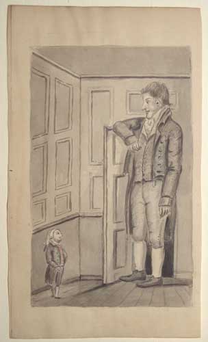 The Irish giant Patrick O'Brien (1760-1806, real name Patrick Cotter), leaning on the top of a door, towering over a dwarf, possibly John Coan (1728-1764), the ‘Norfolk Dwarf', an imaginary meeting. O'Brien was the first man in history with a certified height of over 8 feet (8'1", not 8'7'' as claimed), a record not broken for another century. He took the name O'Brien to claim descent from the legendarily gigantic Brian Boru. Working on the sideshow circuit he became quite wealthy, leaving £2,000 to his mother when he died. He left his clothes to his servant, who displayed them on a mannequin in the Haymarket; his boots are still on display in the Kinsale Museum. Cotter requested that his body be entombed within twelve feet of solid rock to prevent exhumation for scientific or medical research; however in 1972 his remains were examined and his height verified.