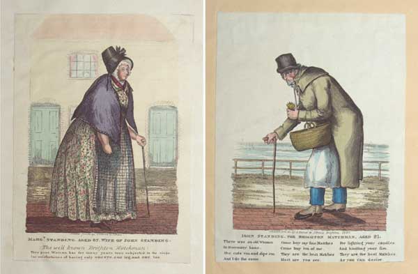 Charming caricatures of a renowned local match-seller and his invalid wife who had one eye, one leg and one toe, from a series of Brighton characters by John Bruce (c.1815 - 1830; fl.)