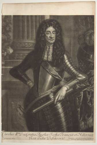 Three-quarter length portrait of Charles II (1630-1685), in long wig and armour, holding a baton. CS 6, state iii of iii, originally published by Alexander Browne. Simon Turner: iv of v.
