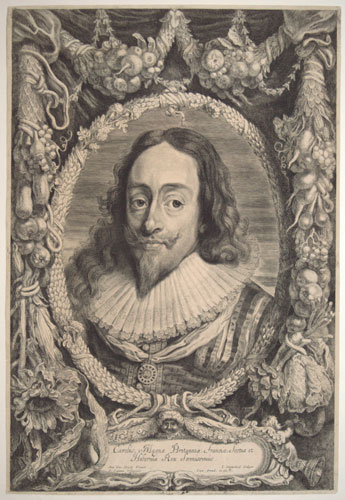 A bust portrait of Charles I (1600-1649) in an oval garland surrounded by flowers and fruit. It was engraved by Jonas Suyderhoef after Pieter Claesz. Soutman's drawing of van Dyck's painting. D 16. i/ii.