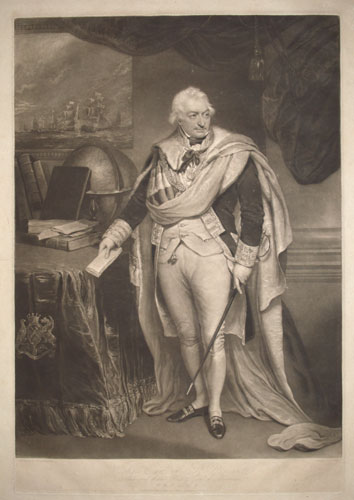 A full-length portrait of George Bridges Rodney (1719 - 1792), first Baron Rodney, naval officer and politician, famous for his victories against the Spanish off Cape St. Vincent in 1780, relieving Gibraltar, and against the French at the Battle of the Saintes in the Caribbean in 1782. The Hon. Thomas Harley commissioned Gainsborough to paint this portrait (now Earl of Rosebery collection, Dalmeny) to commemmorate the Battle of the Saintes. It was engraved by the artist's nephew Gainsborough Dupont. CS 9; Russell 9. Horne 57 II of IV. Ex: collection of Minto Wilson.