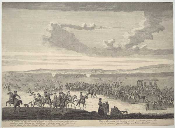 [Newmarket] A View of the Round Course or Plate Course with divers jockeys and Horses in different Actions and Postures going to start for the Kings Plate at New Market.