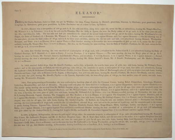 [Full set of eight text descriptions for John Whessell's ''Portraits of Celebrated Running Horses']. Plate I. Eleanor. [&] Plate II. Penelope. [&] Plate III. Bobtail. [&] Plate IV. Parasol. [&] Plate V. Violante. [&] Plate VI. Trumpator [&] Plate VII. Meteora [&] Plate VIII. Dick Andrews.