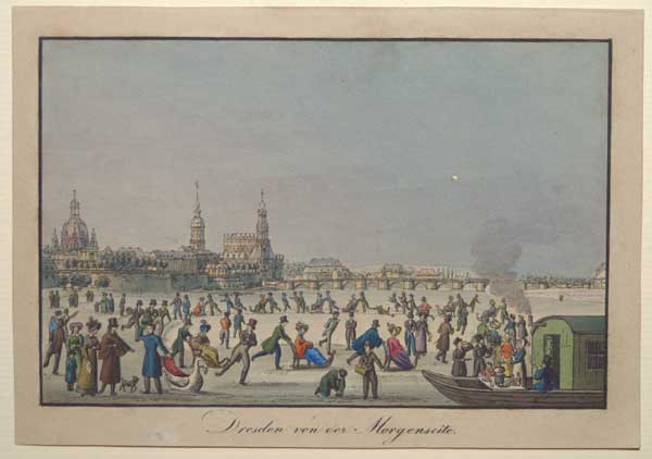 A view of Dresden from the frozen Elbe, with figures skating and sleighing on the ice, with drinks being served from a boat. A Frost Fair item.