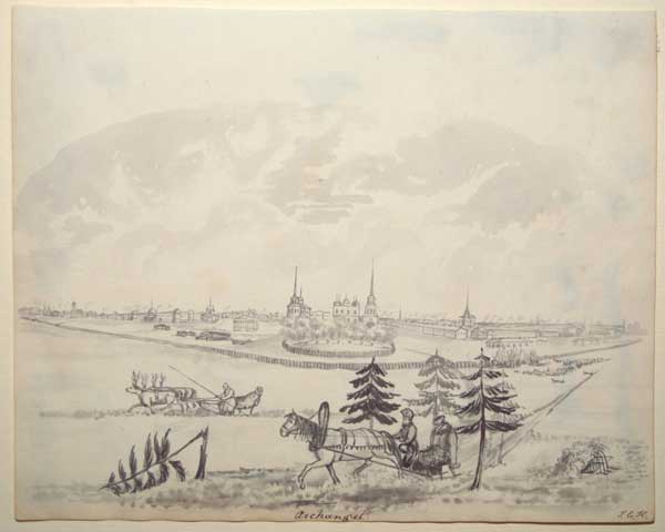 A prospect of Archangel in northern Russia, with sleighs drawn by horses and reindeer.
