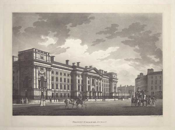 A view from the street of the College of the Holy and Undivided Trinity of Queen Elizabeth near Dublin (known as Trinity College, Dublin), founded by Queen Elizabeth I in 1592. From James Malton's 'A Picturesque and Descriptive View of the City of Dublin', 1792-5. Abbey Scenery: 473; Bonar-Law