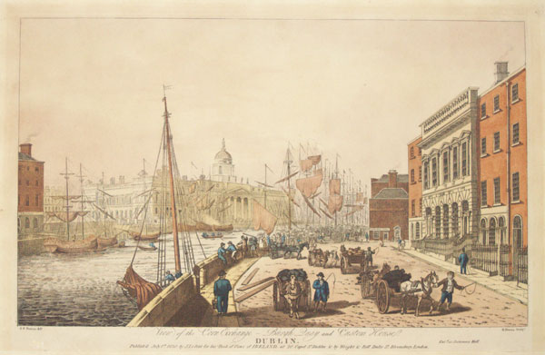 A view of the Custom House from Burgh Quay showing the Corn Exchange on the quay and ships moored there. The image is held in the National Library of Ireland in the Prints and Drawings Collection. This is the second plate in the twelve set series 'Select views of Dublin.' Samuel Frederick Brocas (c. 1792 – 14 May 1847) was an Irish artist best known for this series depicting Dublin. He was the second of the four sons of painter Henry Brocas (Senior). From 1803 to 1807, Brocas studied under his father at the Dublin Society Schools. Henry Brocas (Junior) (1798 – 1872) was an Irish artist known for his landscapes and engravings. He was the fourth of the four sons of painter Henry Brocas, whom he also trained under. Bonar-Law: 3.129.