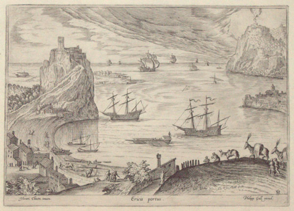 A view of the harbour of Lerici with the castle on a cliff at left, a caravan approaching at right and galleys and galleons in the sea. After Hendrick van Cleve III (1525-c.1589). An example of the first state, before a plate number. H: i of ii.