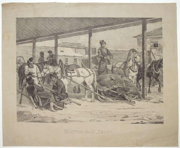 A winter scene in a station, with horse-drawn sledges, with figures including a Tartar.