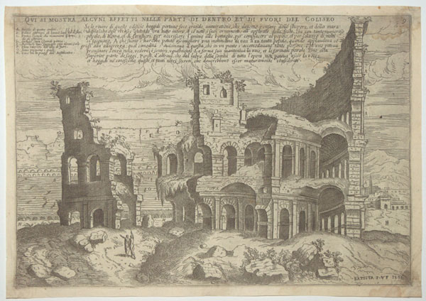 A view looking through the collapsed wall of the Colosseum into the interior. The plate was originally published in 'Discorsi sopra l'antichità di Roma di Vicenzo Scamozzi architetto vicentino, con XL tauole in rame' by Ziletti in 1582; this example has had the original Latin title replaced by an Italian title, description and key.
