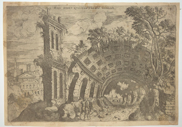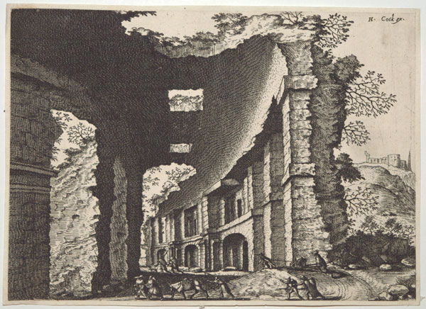 A long and curved barrel vault, probably part of the Colosseum. Hieronymus Cock (c.1517-70) vistited Rome in the late 1540s, inspiring him to start up his own publishing firm in Antwerp in 1548, which became the most important print publishing firm from outside Italy. After his death in 1570 the firm was continued by his widow (Volcxken Diercx) until her death in 1600, when many of the plates were acquired by Philips Galle. However this plate seems to have been acquired by the van Doetecum brothers, who published it in 'Operum Antiquorum Romanorum' in 1562, with Cock's name removed. See BM 1950,0211.111 for the van Doetecum issue.
