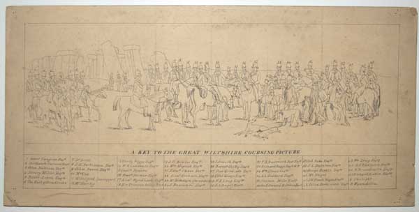 A key of the 46 participants in a coursing match, with the winner and runner up, depicted before Stonehenge.