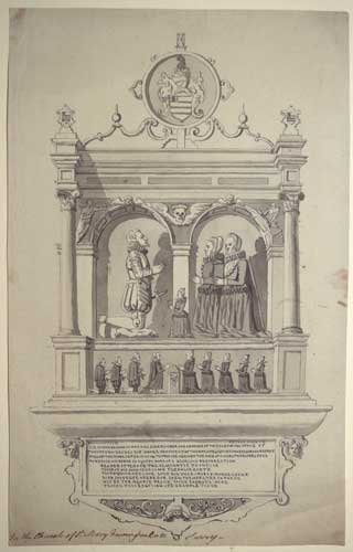 A watercolour of the monument to Sir Hugh Brawne (d.1615), his two wives and six children, once in St Mary's Church, Newington Butts. The church was rebuilt in 1715, 1790, 1876 and after an air raid in 1941, and it is uncertain when this memorial was removed. We have found no photographic record of the monument.