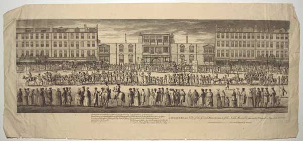 The front of a procession of mock freemasons marching down the Strand in 1742, passing in front of the facade of the old Somerset House (demolished from 1775). Although this left sheet lacks a publication line the use of wove paper suggests the Vivares ree-issued of the 1742 plate. BM G,5.210 for the Vivares issue. See BM Satires 2546.II for the original.