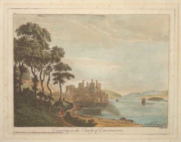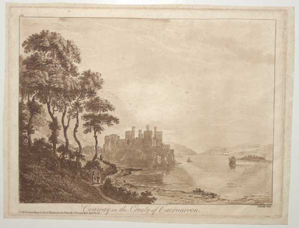 View of Conwy Castle at sunset, published in Part II of Sandby's 'Views in Wales', the first series of aquatints published in Britain. Abbey Scenery: 511.