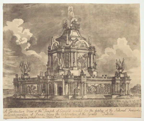 A Perspective View of the Temple of Concord erected for the display of the National Fireworks in Commemoration of Peace, being the Celebration of the Grand Jubilee.