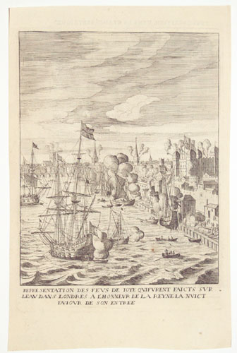 Illustration to Jean Puget de la Serre's (1595-1665), 'Histoire de l'entrée de la Reyne Mère dans la Grande Brétaigne' (London, George Thomason and Octavian Pullen, 1639). Fires lit in the Tower of London and other buildings, and cannons firing from the banks of the Thames and ships on the river, in honour of Queen Marie de Medici's (1573-1642) arrival in London.