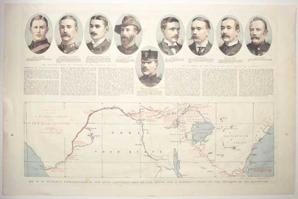 A map of central Africa and nine roundel portraits of members of Henry Morton Stanley expedition (1886-9) to relieve the governor of Equatoria (south Sudan) from Mahdist forces. Published in the Graphic Newspaper.
