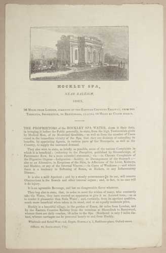 Hockley Spa, Near Raleigh, Essex. 36 Miles from London, Starting by the Eastern Counties Railway, from the Terminus Shoreditch, to Brentford, Leaving 18 Miles by Coach Direct.